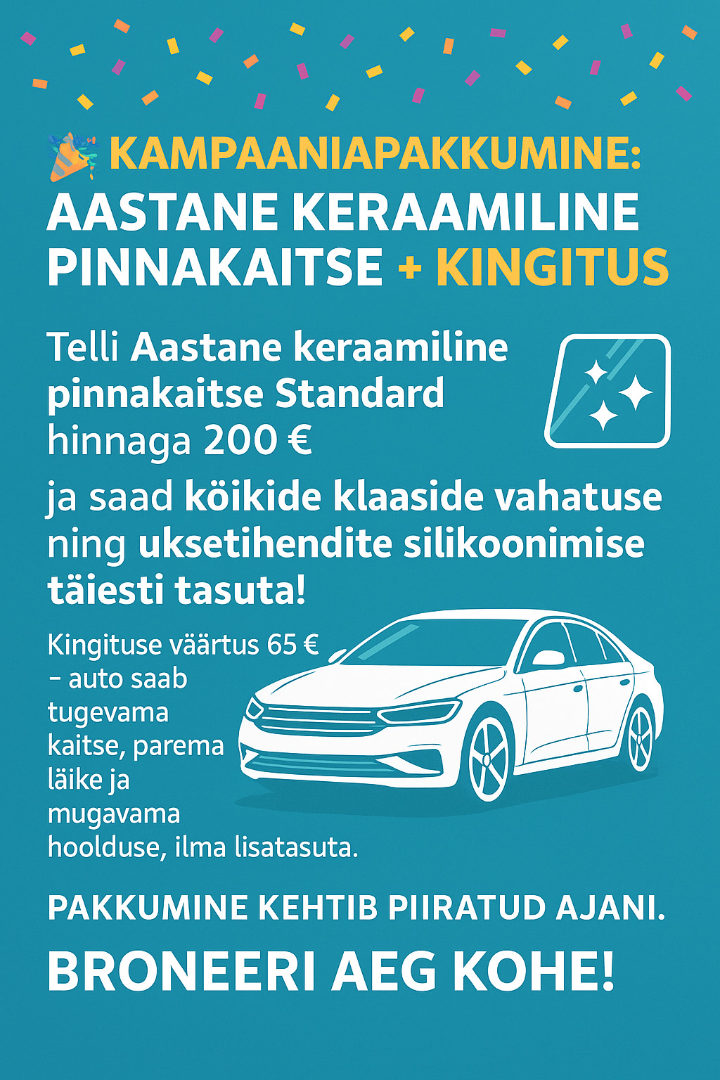 Telli Aastane keraamiline pinnakaitse Standard hinnaga 200 € ja saad kõikide klaaside vahatuse ning uksetihendite silikoonimise täiesti tasuta!